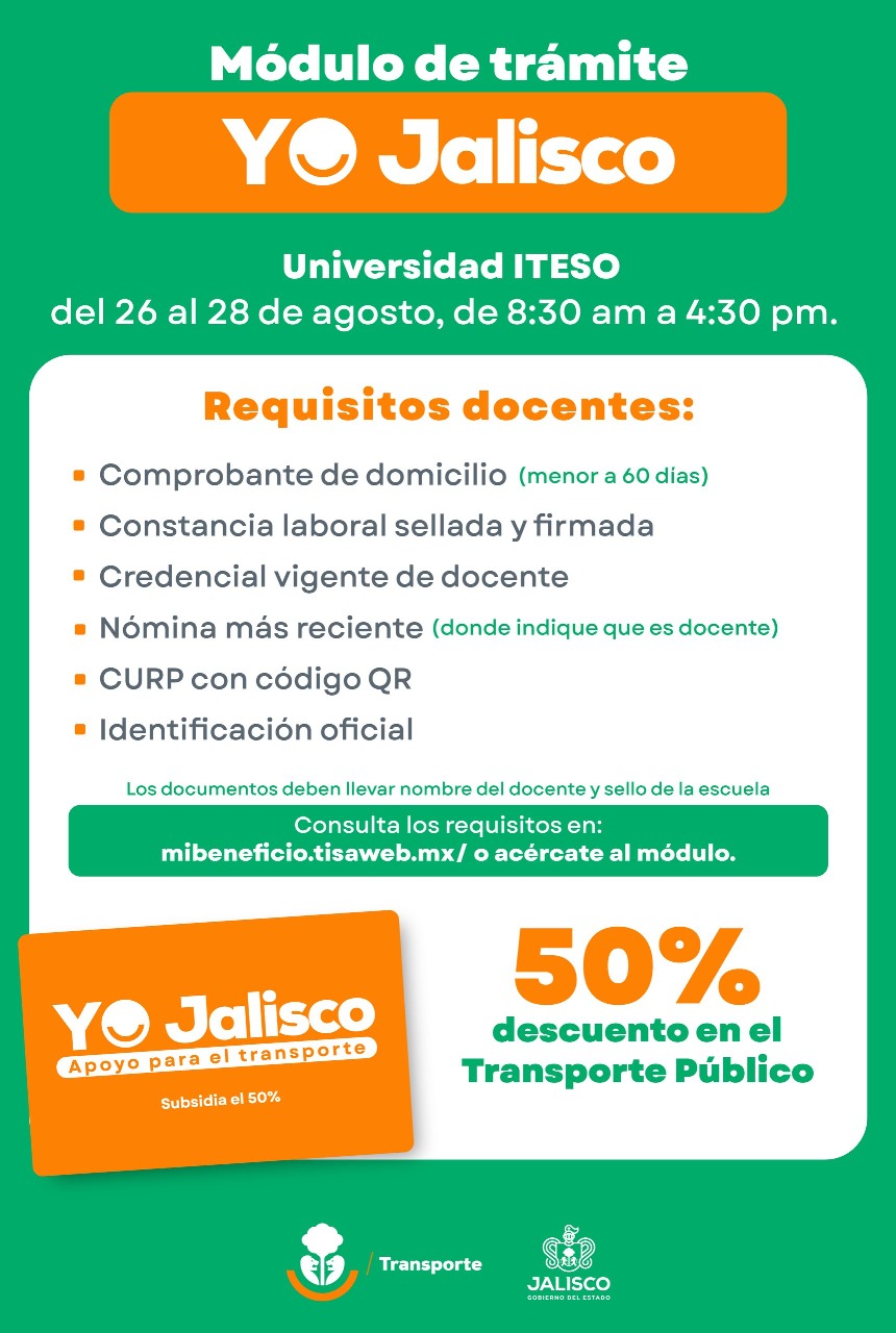 La Secretaría de Movilidad y Transporte de Jalisco por medio de su programa y tarjeta Yo Jalisco , pondrá un módulo de credencialización de la tarjeta con 50% de descuento en transporte público para estudiantes y profesores.
