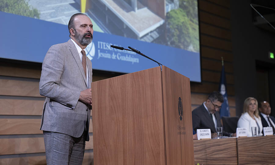 Es martes y todavía se sienten los efectos de la lluvia de la noche anterior. En el nuevo auditorio están congregadas autoridades del ITESO, de la Compañía de Jesús, así como representantes de gobierno y de la comunidad universitaria. La ceremonia para inaugurar el nuevo edificio del campus es conducida por Mónica Durán Labrador, directora de la Prepa ITESO, y por Carlos Araujo, exdirector del bachillerato y actual director de la Oficina de Educación Continua. Ceden la palabra a Guillermo Gatt Corona, quien, dice, da la bienvenida a las y los asistentes “como presidente de ITESO, AC, pero también como egresado y profesor”. Después menciona que con la apertura del nuevo edificio el campus se consolida como uno “de los mejor equipados, seguros y sostenibles de México”. El diseño del arquitecto Javier Díaz, dice Gatt Corona, “es un orgullo como itesianos y como jaliscienses”.