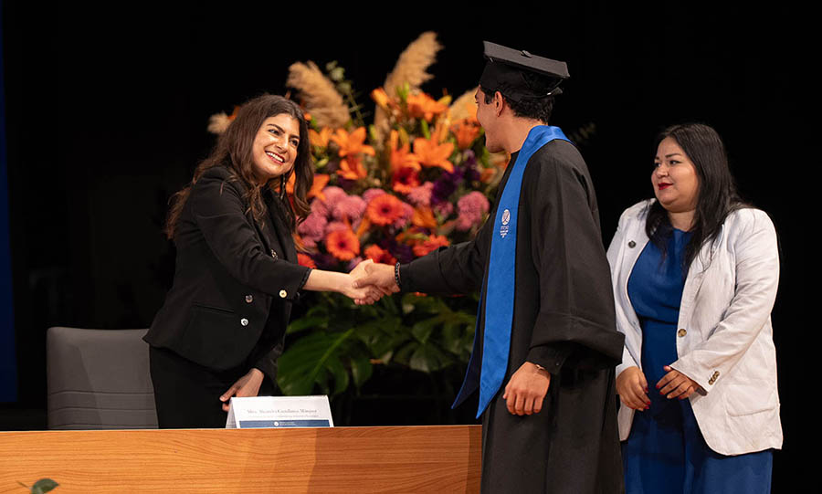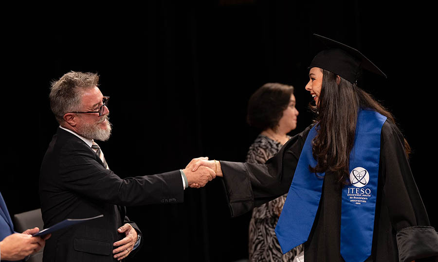 Destacó que en el ITESO se busca formar personas que no sean únicamente profesionales competentes, sino también seres humanos sensibles y comprometidos: “Un elemento clave en su formación fue el amor, ese amor que se percibe en este auditorio y que fue nutrido por sus madres, padres y seres queridos, quienes les ofrecieron su apoyo para que pudieran enfocarse en los estudios”.